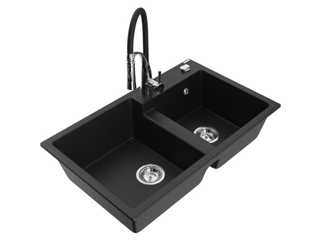 Granitový drez Mexen Tomas s 2 miskami a kuchynskou batériou Aster, čierny - 6516-77-73450-07