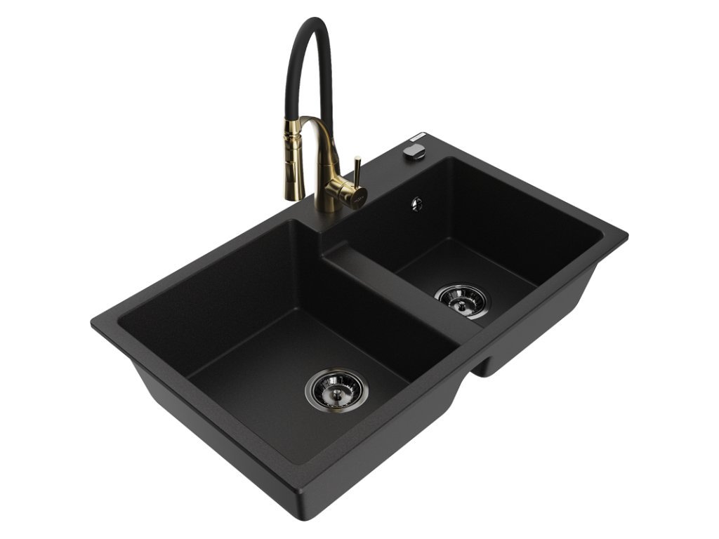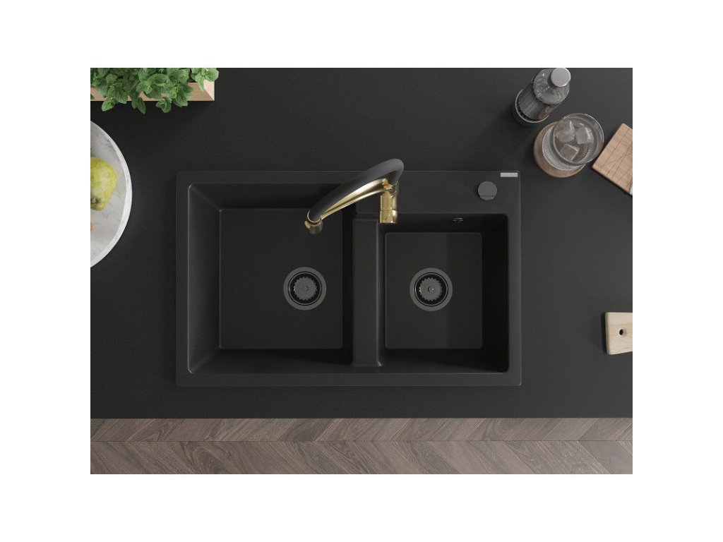 Granitový drez Mexen Tomas s 2 miskami a kuchynskou batériou Aster, čierny - 6516-77-73450-57-B