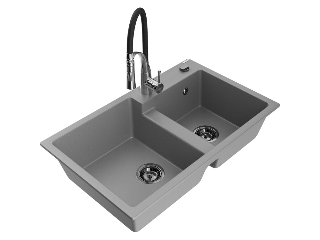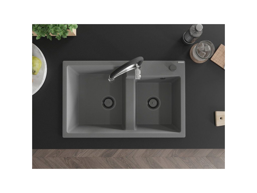 Granitový drez Mexen Tomas s 2 miskami a kuchynskou batériou Aster, sivý - 6516-71-73450-07-B