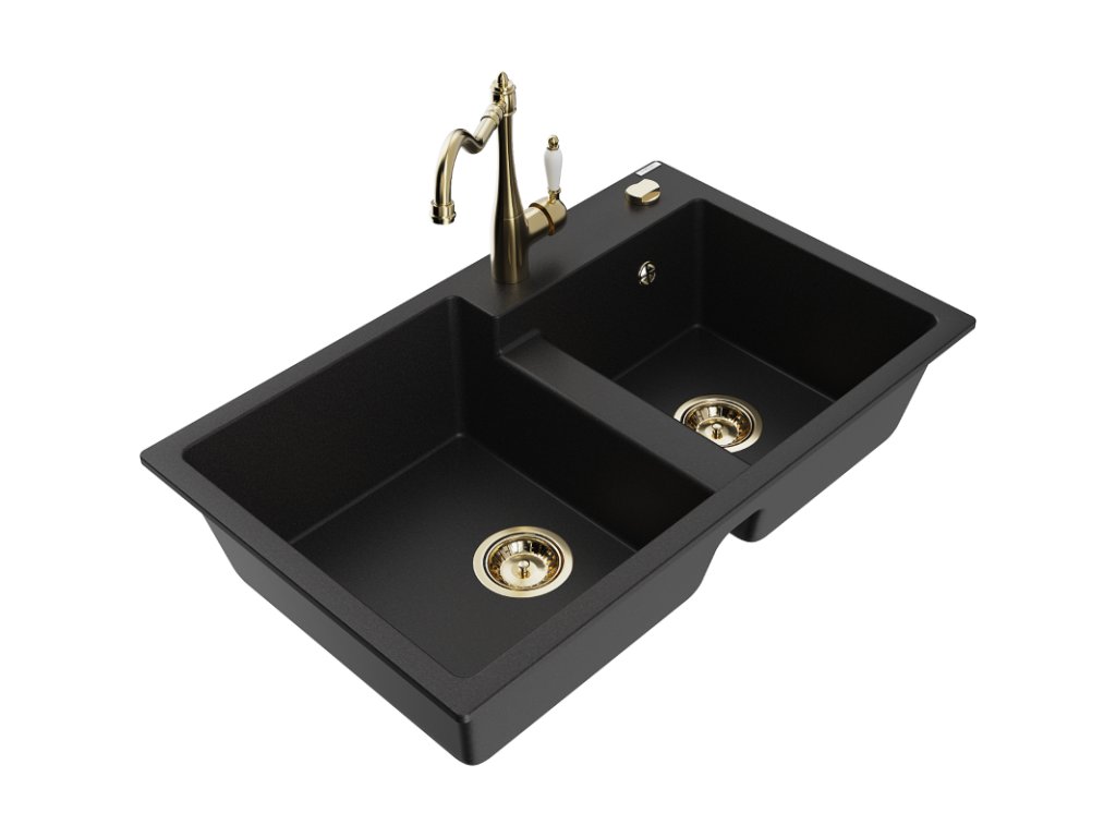 Granitový drez Mexen Tomas s 2 miskami a kuchynskou batériou Carla, čierny - 6516-77-670700-50