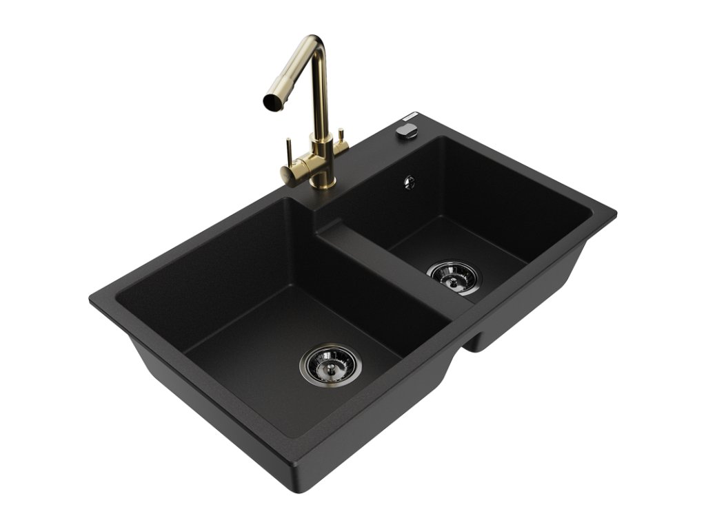 Granitový drez Mexen Tomas s 2 miskami a kuchynskou batériou Duero, čierny - 6516-77-671600-50-B