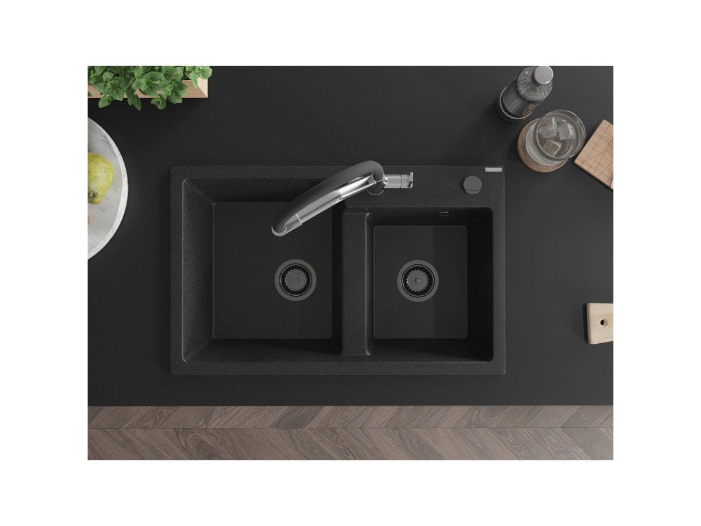 Granitový drez Mexen Tomas s 2 miskami a kuchynskou batériou Duo, čierna/strieborná metalíza - 6516-73-671701-07-B
