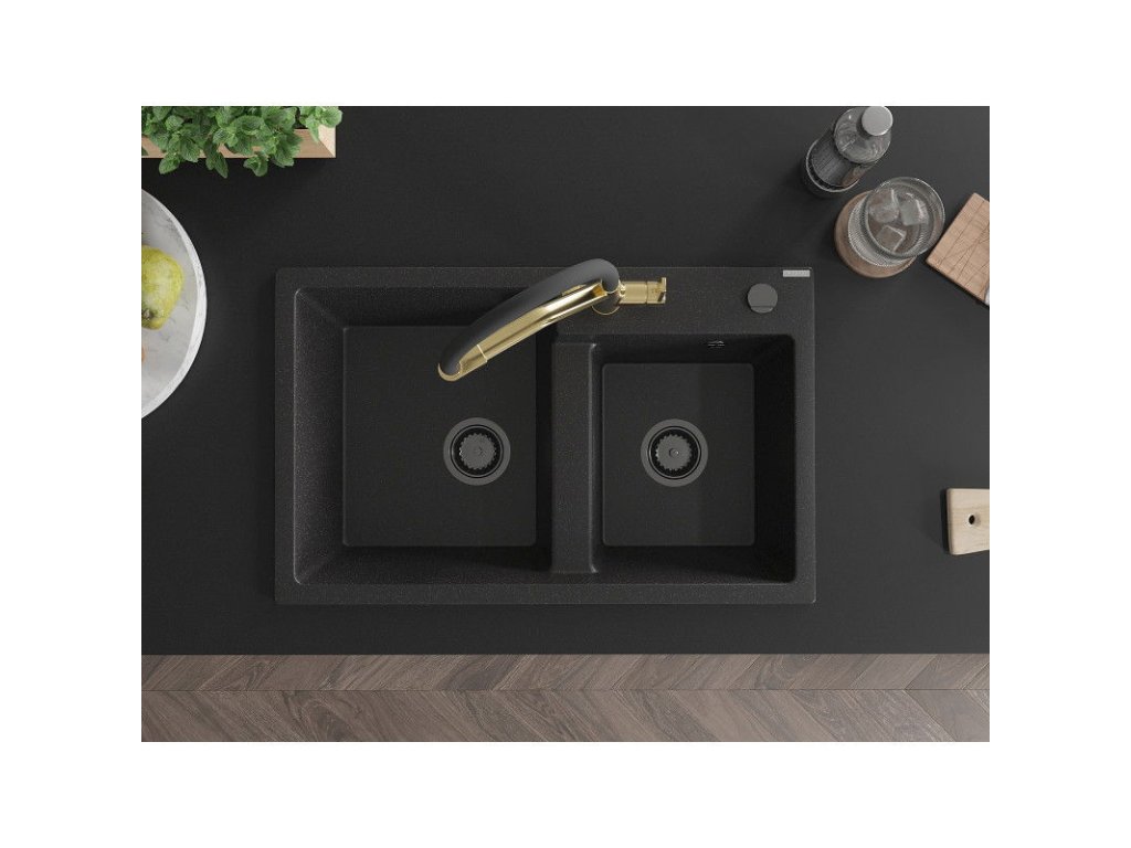 Granitový drez Mexen Tomas s 2 miskami a kuchynskou batériou Duo, čierna/strieborná metalíza - 6516-73-671701-57-B