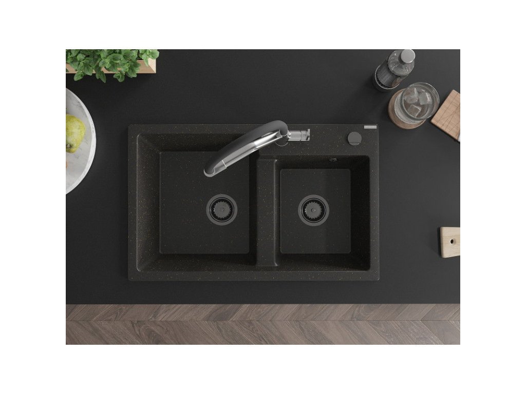 Granitový drez Mexen Tomas s 2 miskami a kuchynskou batériou Duo, čierna/zlatá metalíza - 6516-75-671701-07-B