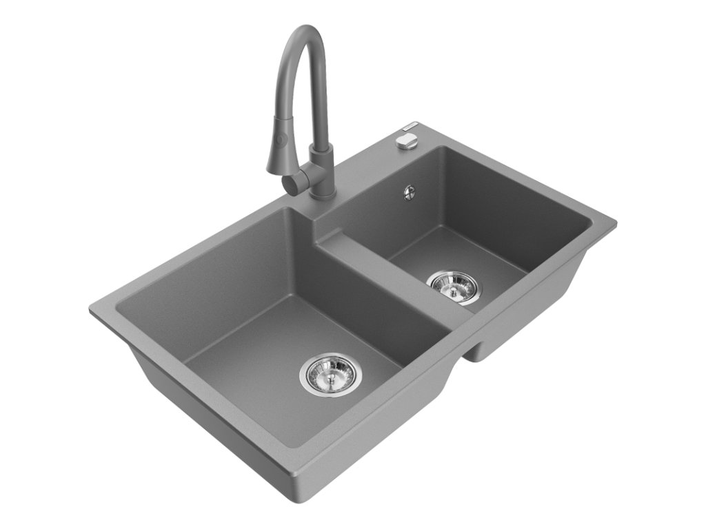 Granitový drez Mexen Tomas s 2 miskami a kuchynskou batériou Elia, sivý - 6516-71-670101-71