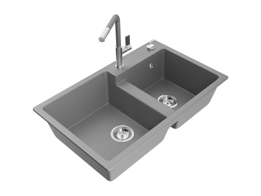 Granitový drez Mexen Tomas s 2 miskami a kuchynskou batériou Flora, sivý - 6516-71-670401-06