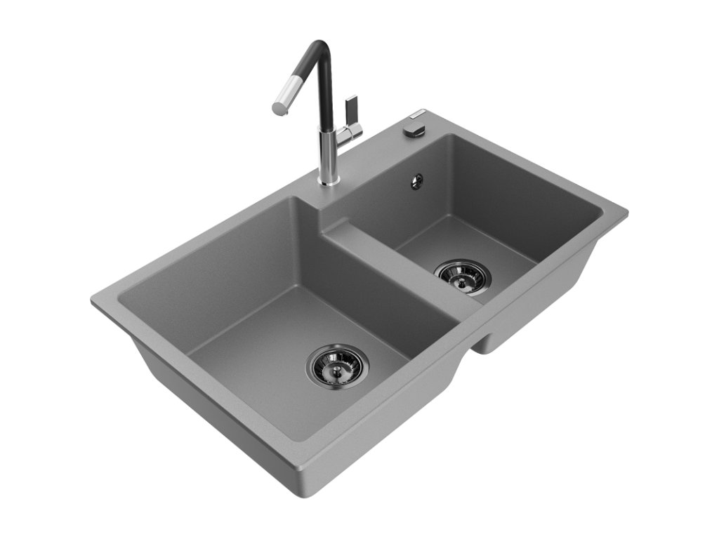 Granitový drez Mexen Tomas s 2 miskami a kuchynskou batériou Flora, sivý - 6516-71-670401-07-B
