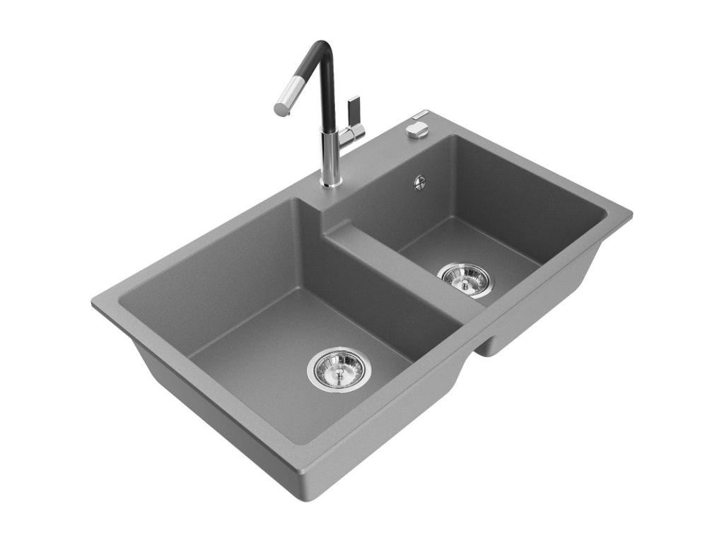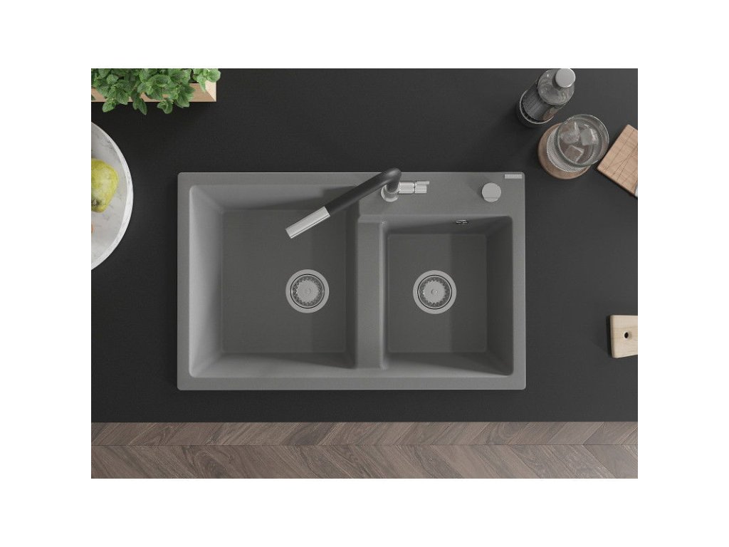 Granitový drez Mexen Tomas s 2 miskami a kuchynskou batériou Flora, sivý - 6516-71-670401-07