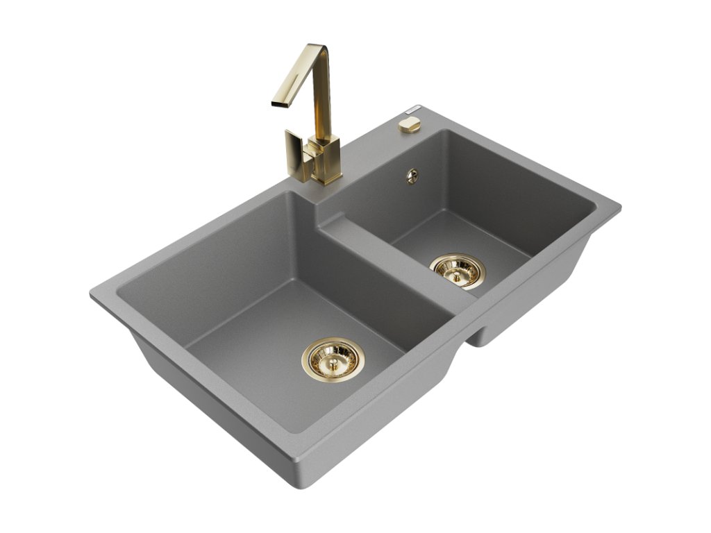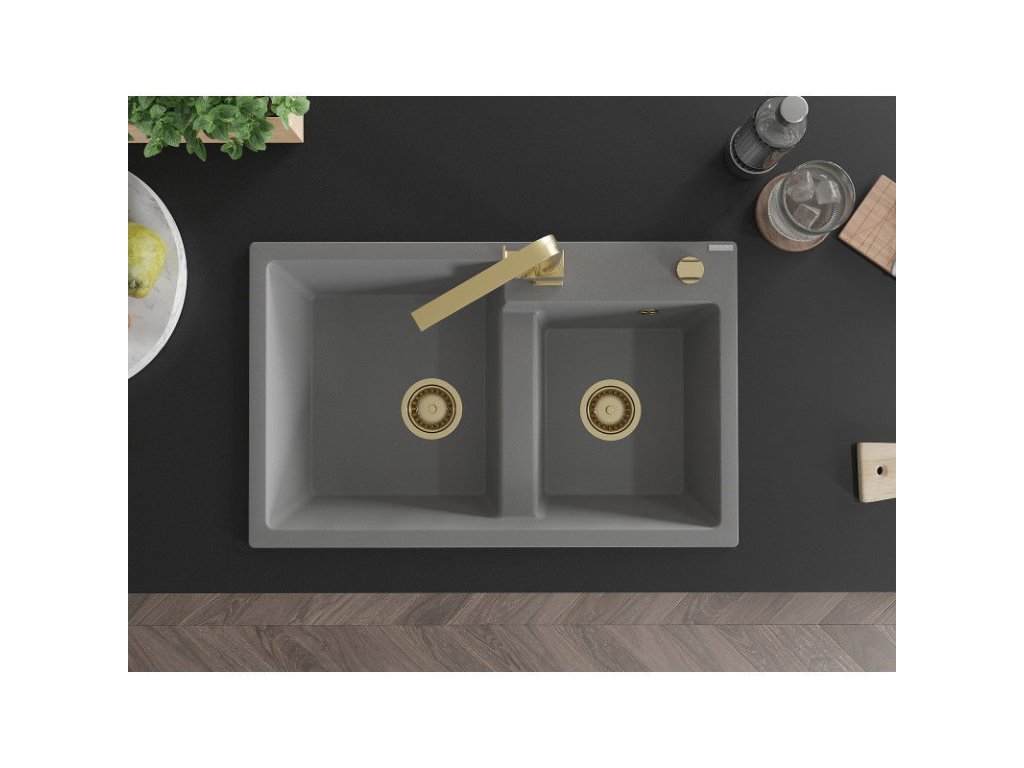 Granitový drez Mexen Tomas s 2 miskami a kuchynskou batériou Rita, sivý - 6516-71-670300-50