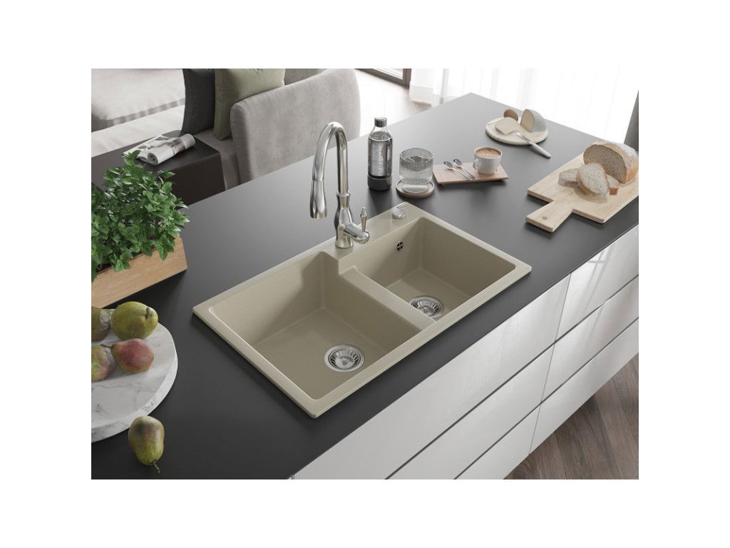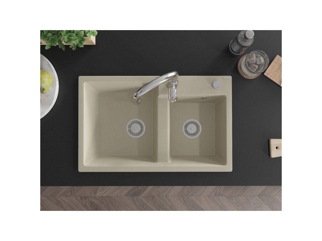 Granitový drez Mexen Tomas s 2 miskami a kuchynskou batériou Savita, béžový - 6516-69-672601-00