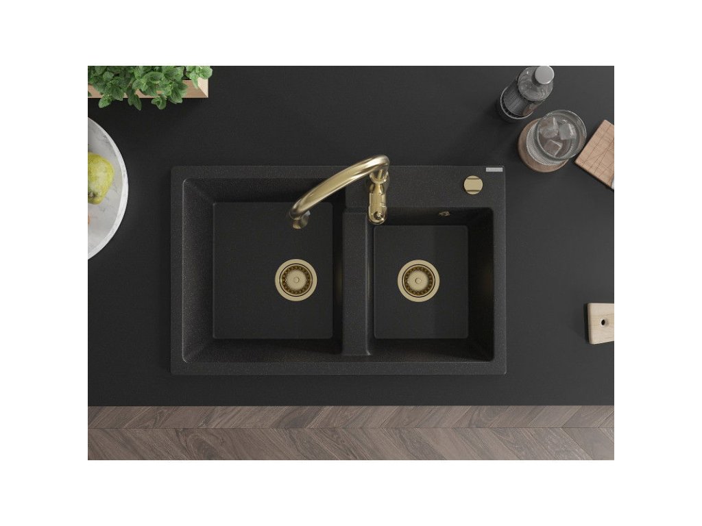 Granitový drez Mexen Tomas s 2 miskami a kuchynskou batériou Savita, čierna/strieborná metalíza - 6516-73-672601-50