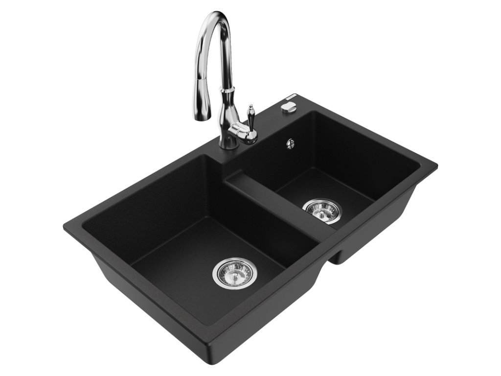 Granitový drez Mexen Tomas s 2 miskami a kuchynskou batériou Savita, čierny - 6516-77-672601-00