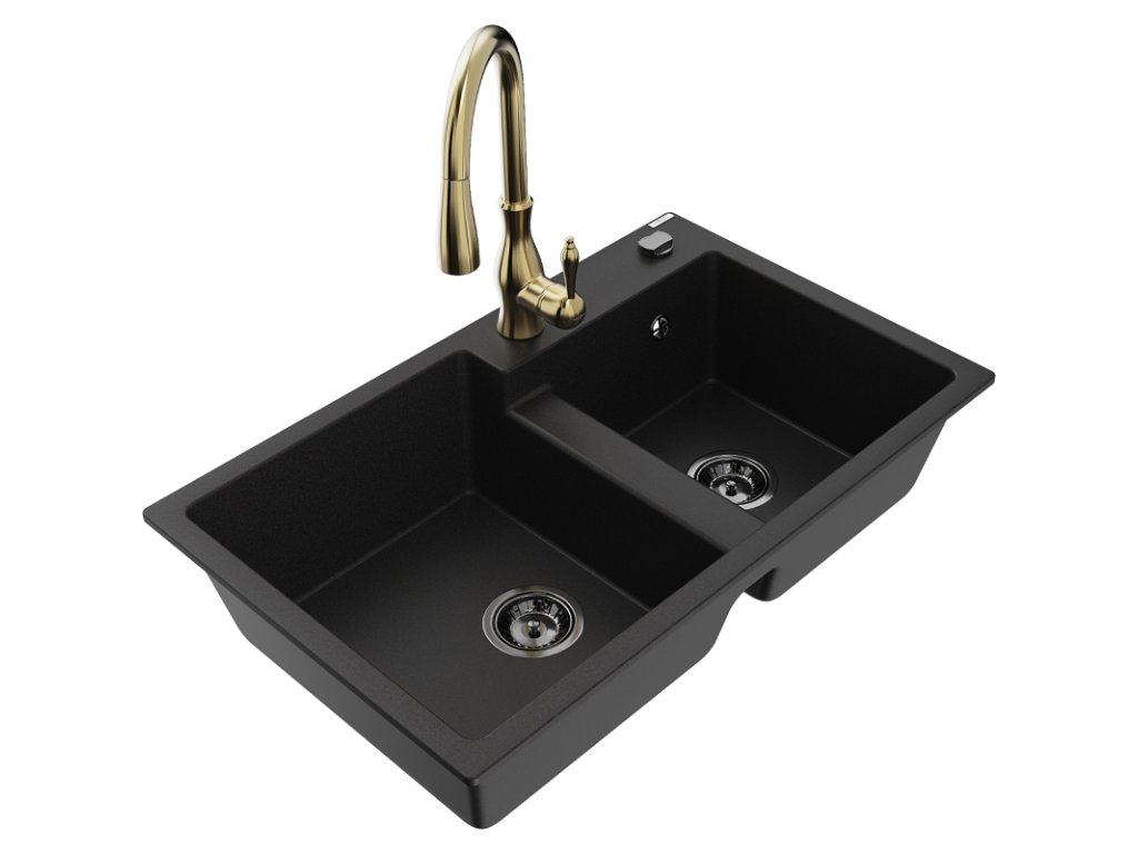 Granitový drez Mexen Tomas s 2 miskami a kuchynskou batériou Savita, čierny - 6516-77-672601-50-B