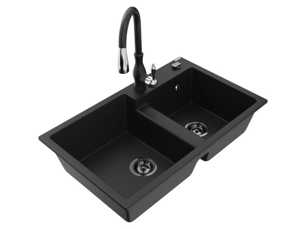 Granitový drez Mexen Tomas s 2 miskami a kuchynskou batériou Savita, čierny - 6516-77-672601-70-B