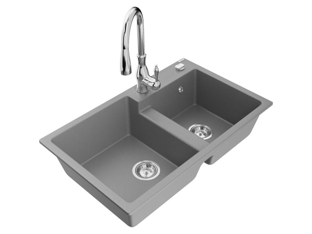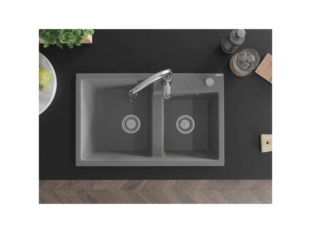 Granitový drez Mexen Tomas s 2 miskami a kuchynskou batériou Savita, sivý - 6516-71-672601-00