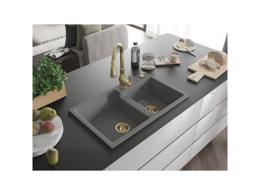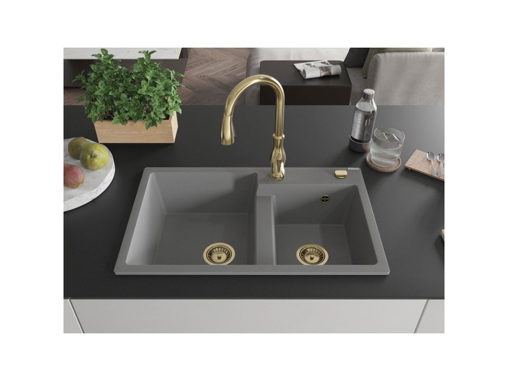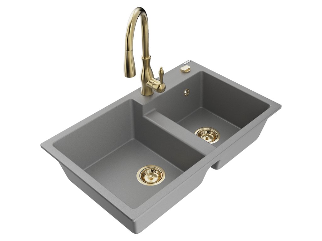 Granitový drez Mexen Tomas s 2 miskami a kuchynskou batériou Savita, sivý - 6516-71-672601-50
