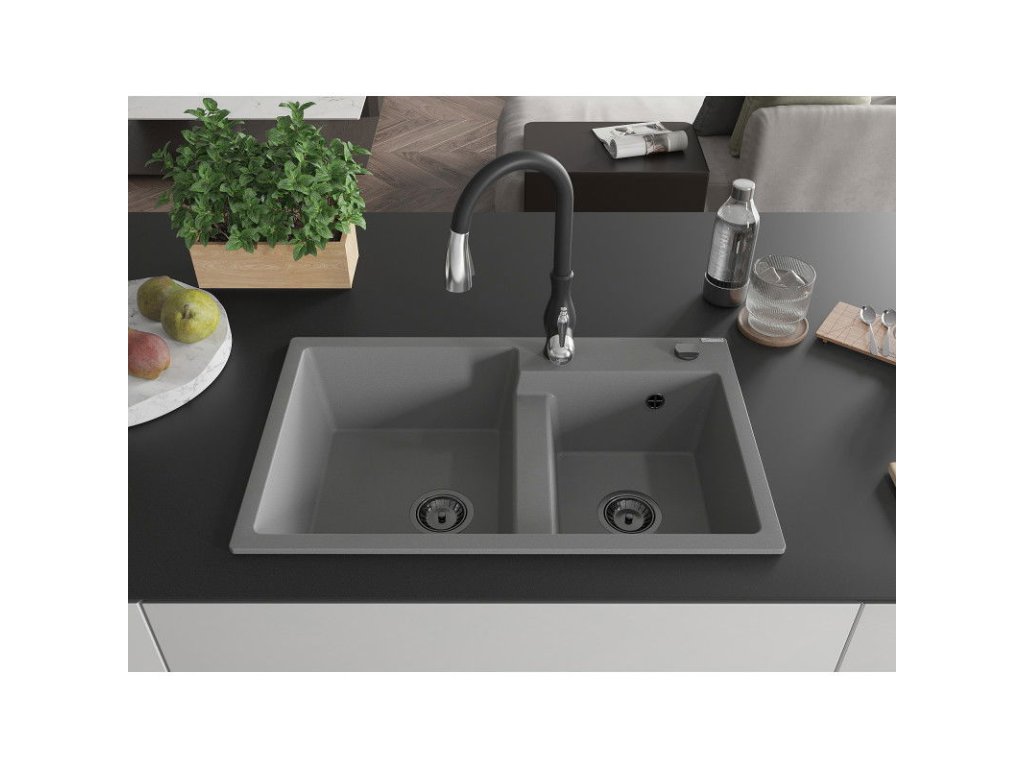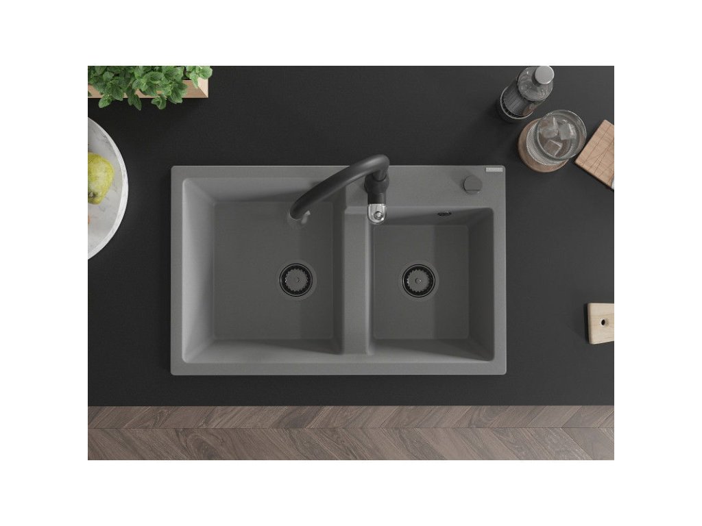 Granitový drez Mexen Tomas s 2 miskami a kuchynskou batériou Savita, sivý - 6516-71-672601-70-B