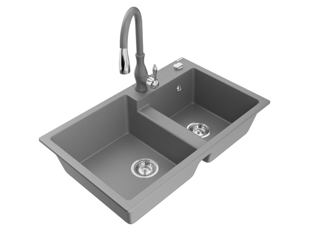 Granitový drez Mexen Tomas s 2 miskami a kuchynskou batériou Savita, sivý - 6516-71-672601-71