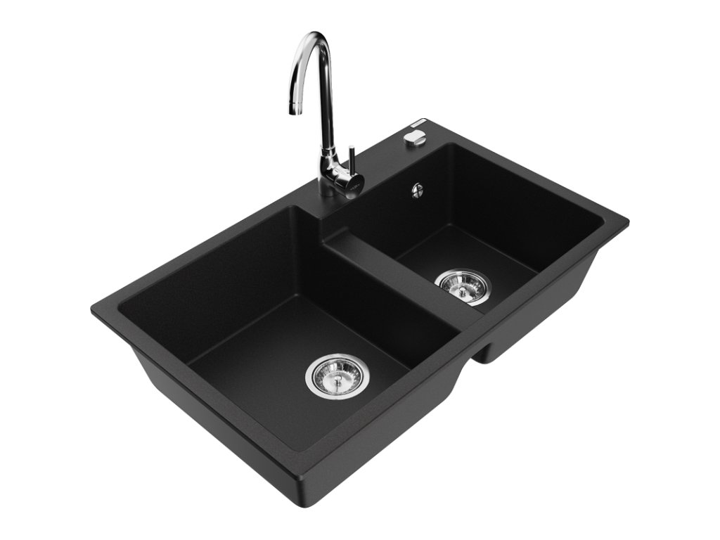 Granitový drez Mexen Tomas s 2 miskami a kuchynskou batériou Telma, čierny - 6516-77-670200-00