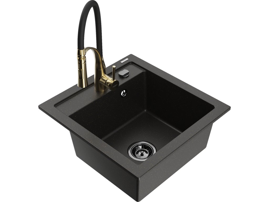 Granitový drez Mexen Vito s 1 misou a batériou Aster, čierna/zlatá metalíza - 6503-75-73450-57-B