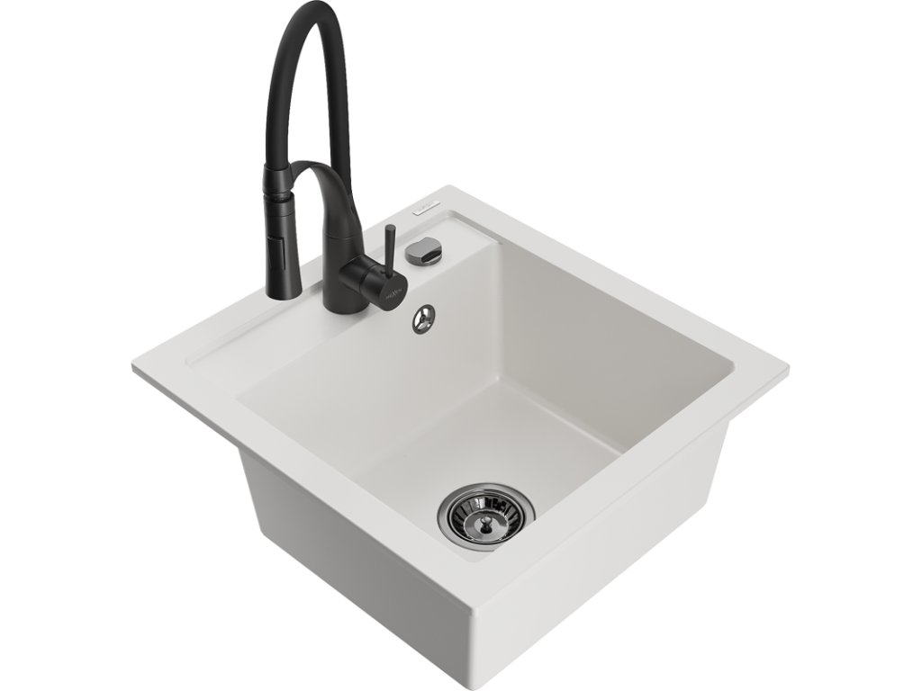Granitový drez Mexen Vito s 1 misou a kuchynskou batériou Aster, biely - 6503-20-73450-70-B
