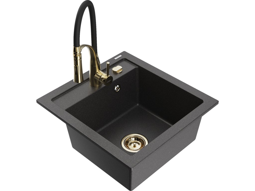 Granitový drez Mexen Vito s 1 misou a kuchynskou batériou Aster, čierna škvrnitá - 6503-76-73450-57-G