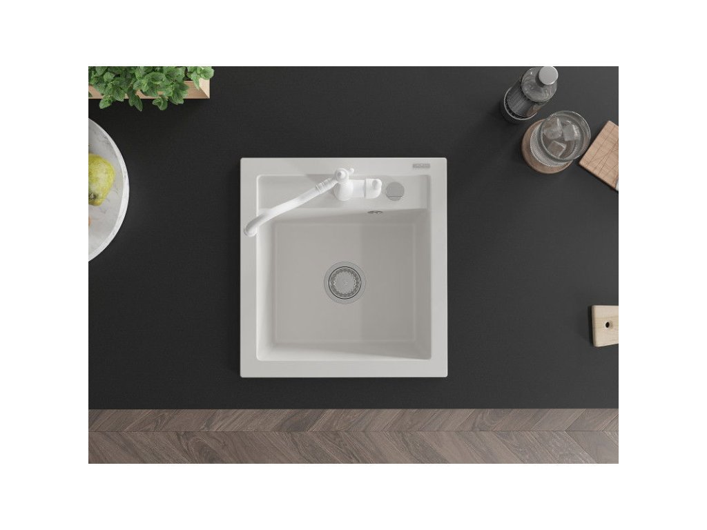 Granitový drez Mexen Vito s 1 misou a kuchynskou batériou Carla, biely - 6503-20-670700-20