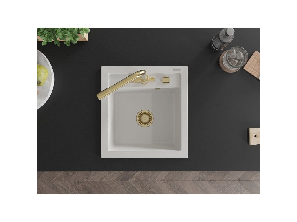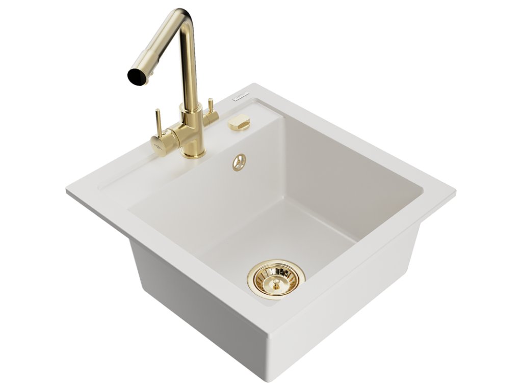 Granitový drez Mexen Vito s 1 misou a kuchynskou batériou Duero, biely - 6503-20-671600-50