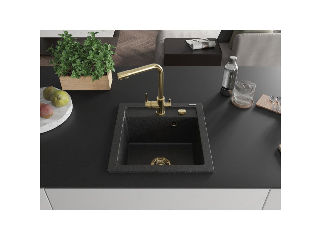 Granitový drez Mexen Vito s 1 misou a kuchynskou batériou Duero, čierna/strieborná metalíza - 6503-73-671600-50