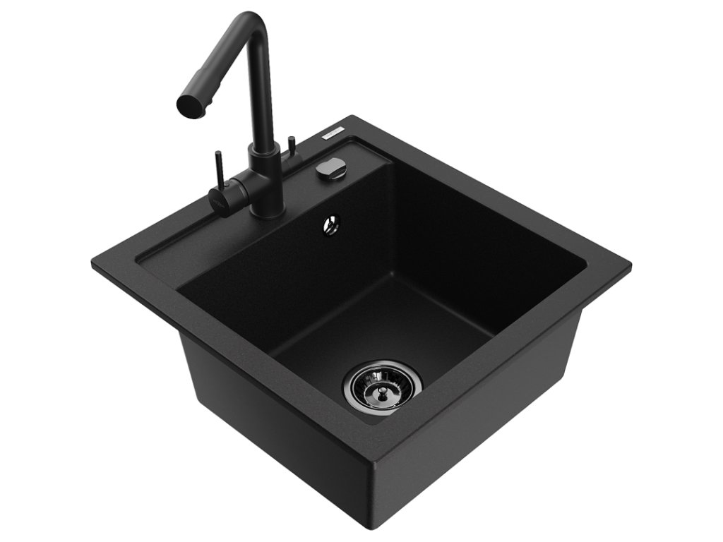 Granitový drez Mexen Vito s 1 misou a kuchynskou batériou Duero, čierny - 6503-77-671600-70-B