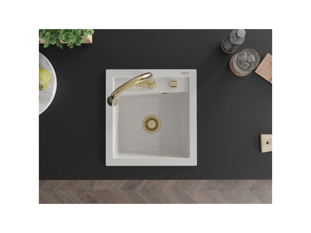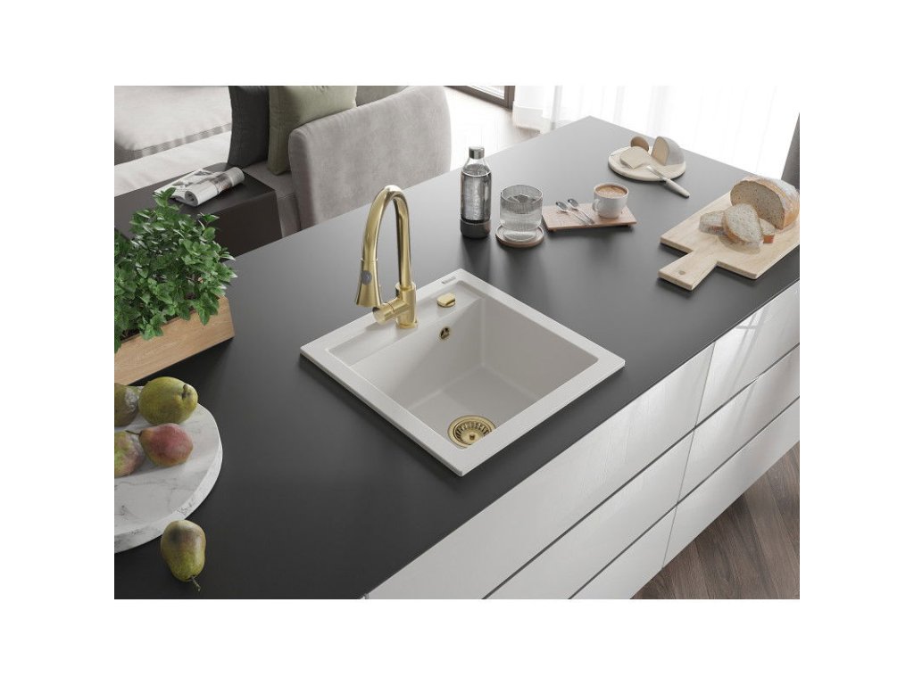 Granitový drez Mexen Vito s 1 misou a kuchynskou batériou Elia, biely - 6503-20-670101-50