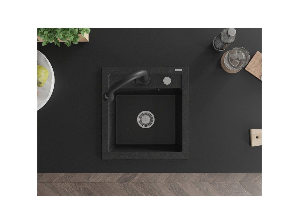 Granitový drez Mexen Vito s 1 misou a kuchynskou batériou Elia, čierna/strieborná metalíza - 6503-73-670101-70