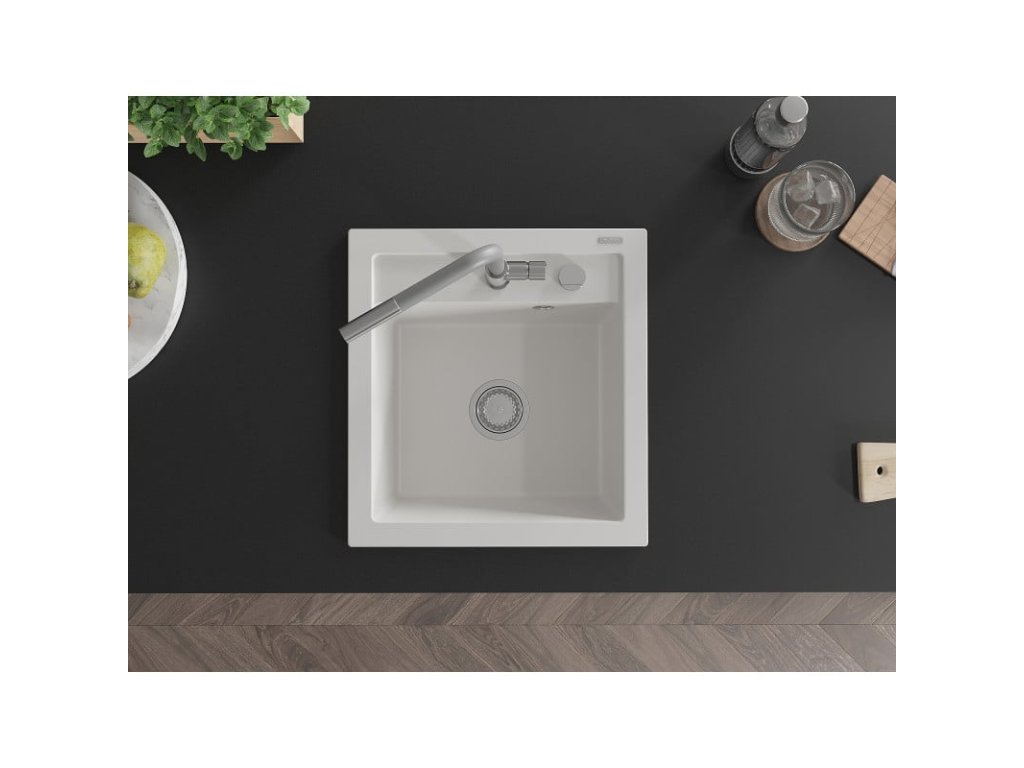 Granitový drez Mexen Vito s 1 misou a kuchynskou batériou Flora, biely - 6503-20-670401-06