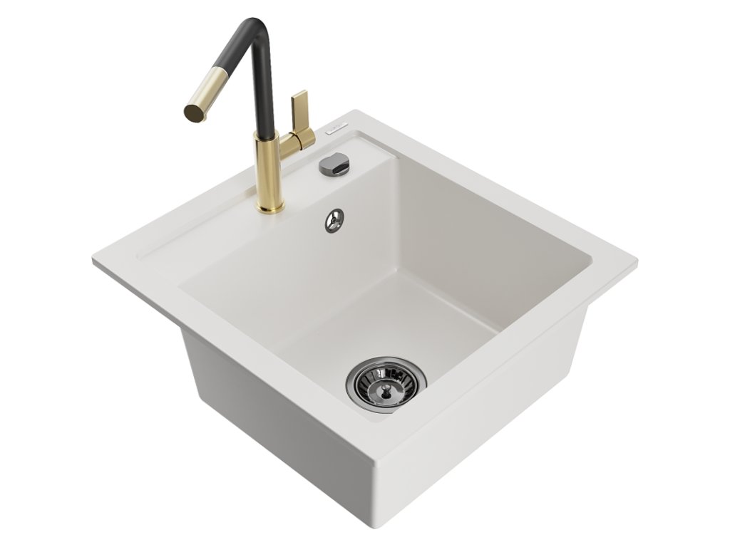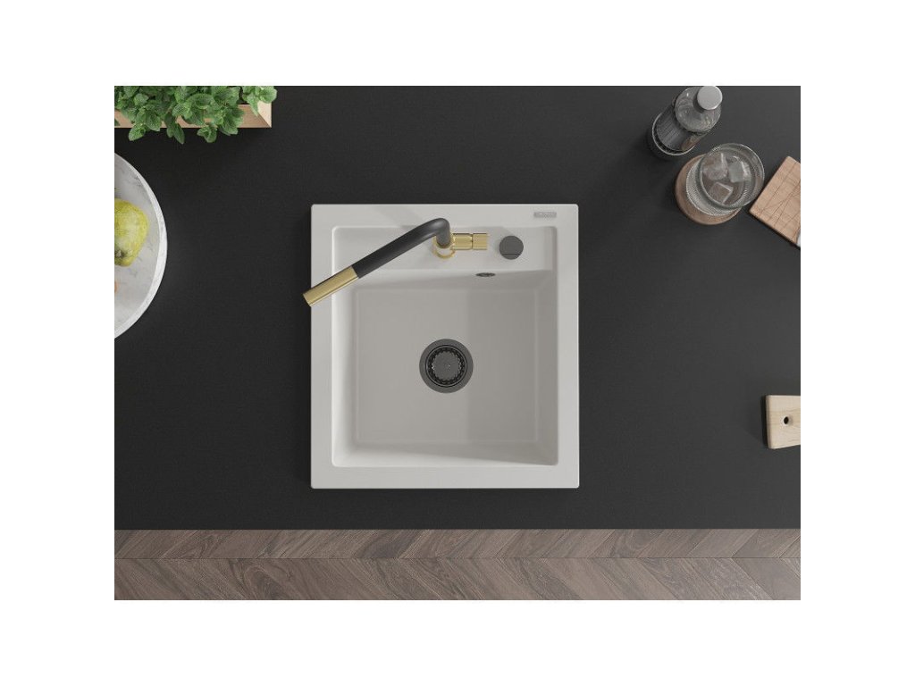 Granitový drez Mexen Vito s 1 misou a kuchynskou batériou Flora, biely - 6503-20-670401-57-B