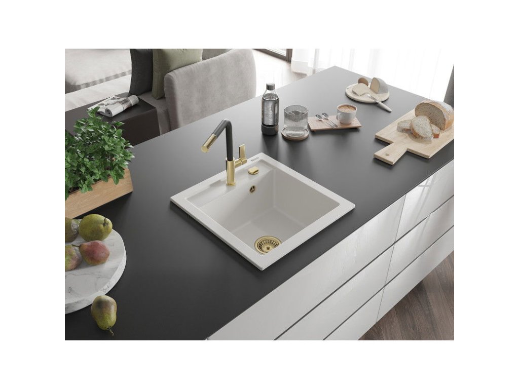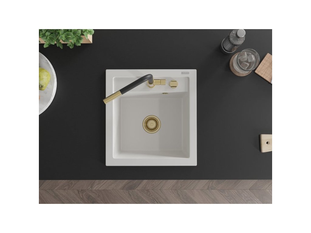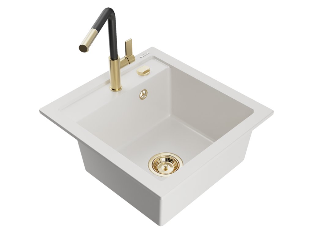 Granitový drez Mexen Vito s 1 misou a kuchynskou batériou Flora, biely - 6503-20-670401-57-G