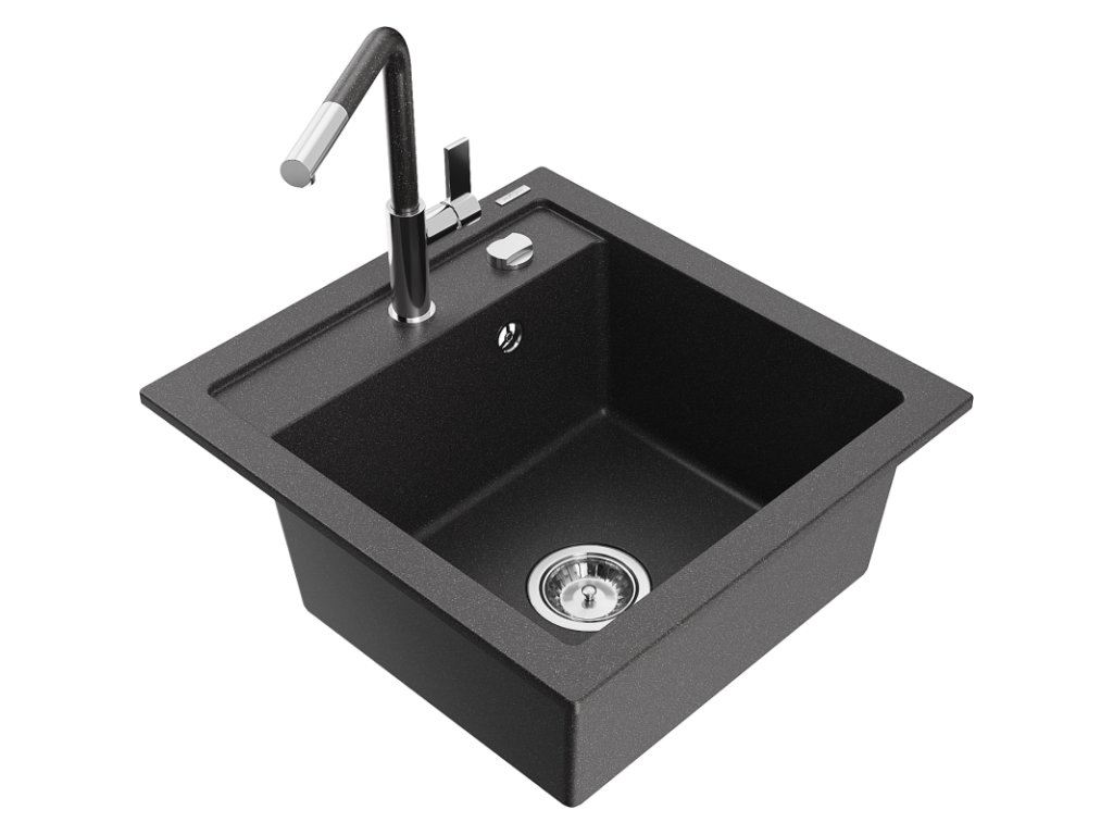 Granitový drez Mexen Vito s 1 misou a kuchynskou batériou Flora, čierna škvrnitá - 6503-76-670401-08