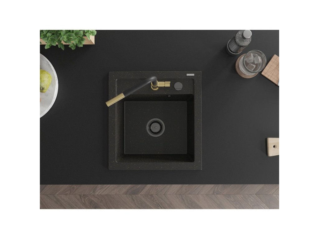 Granitový drez Mexen Vito s 1 misou a kuchynskou batériou Flora, čierna/zlatá metalíza - 6503-75-670401-57-B