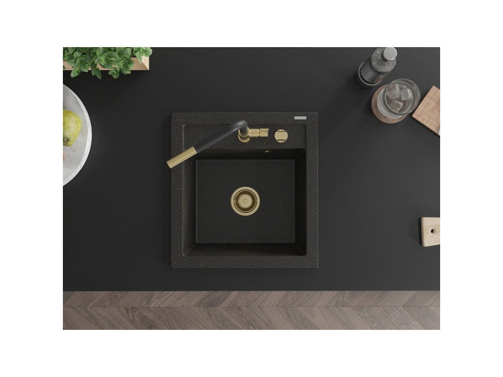 Granitový drez Mexen Vito s 1 misou a kuchynskou batériou Flora, čierna/zlatá metalíza - 6503-75-670401-57-G