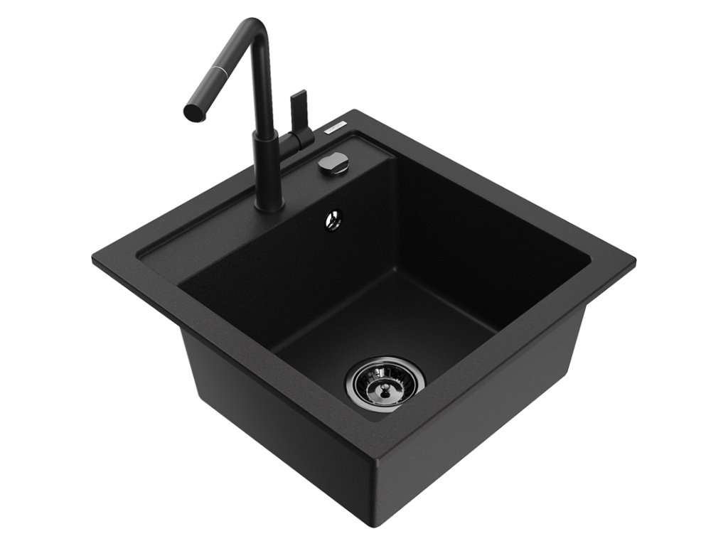 Granitový drez Mexen Vito s 1 misou a kuchynskou batériou Flora, čierny - 6503-77-670401-70-B