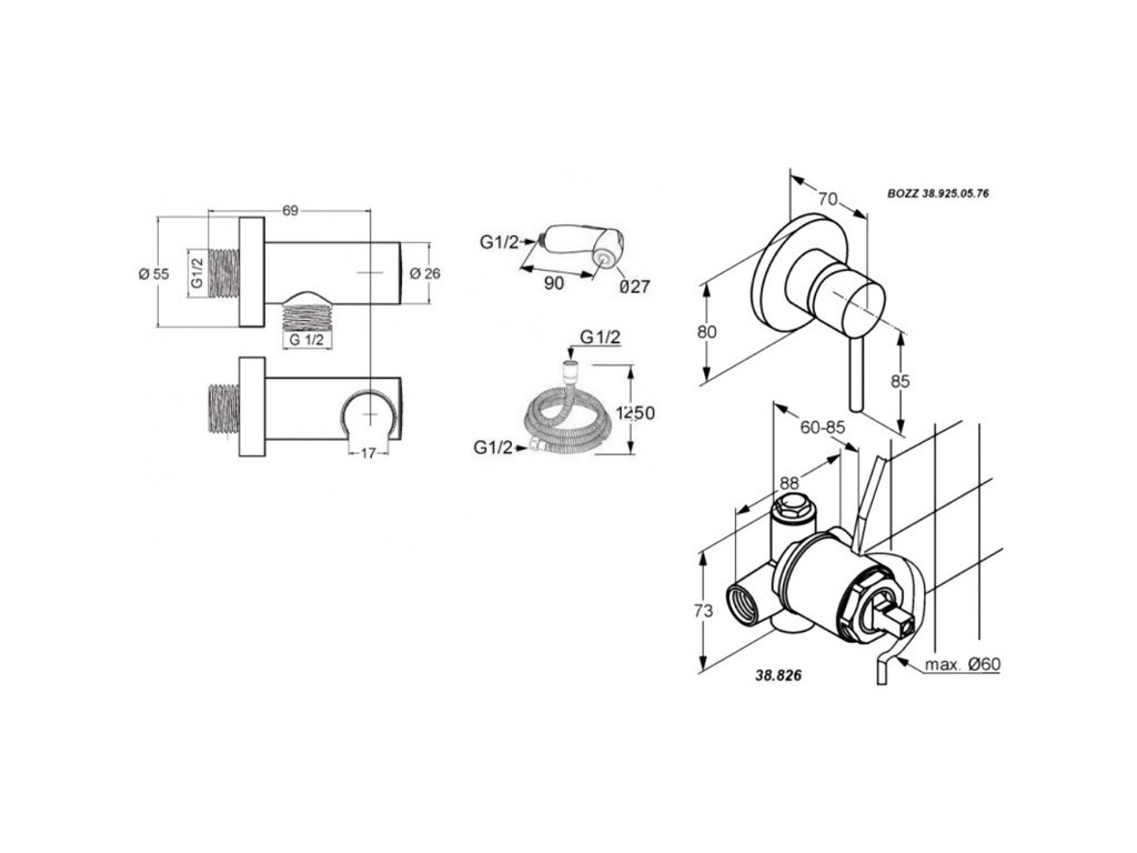 Vlastnosti produktu\nhĺbka 70 mm\nrozmer DN 15\ndĺžka sprchovej hadice 1250 mm\npripojenie hadice G1/2 x G1/2\nkeramická kartuša s horúcovodnou poistkou\nfarba chróm\nhygienická spŕška so stop ventilom\npripojovacie kolienko s držiakom spŕšky\nmontážna hĺbka telesa 60 - 85 mm\nchránená proti spätnému prúdeniu\nhadica nie je tlaková, po použití spŕšky zavrieť pákou prívod vody\nvrátane podomietkového telesa\n