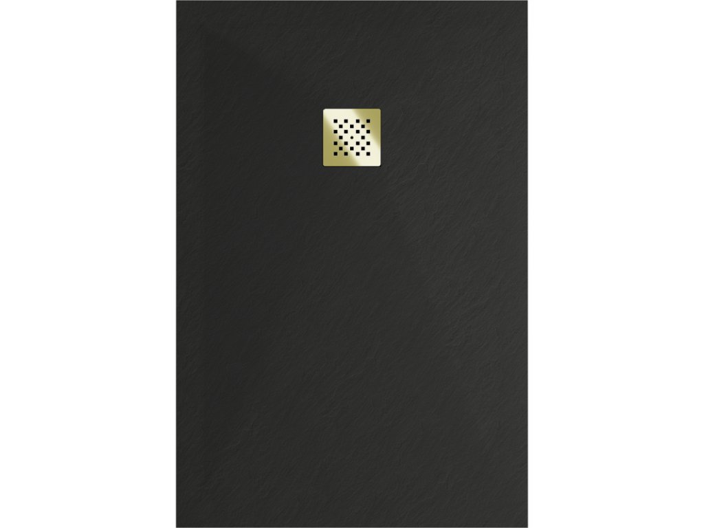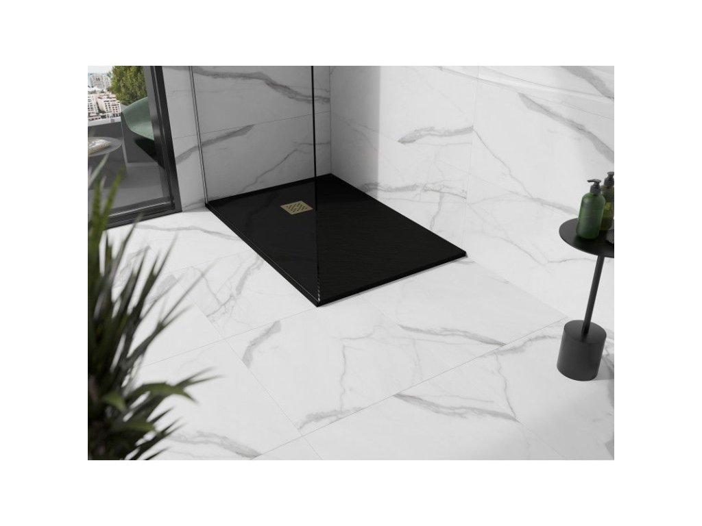 Kompozitná obdĺžniková sprchová vanička Mexen Stone+ 110 x 90 cm, čierna, zlatá mriežka - 44709011-G