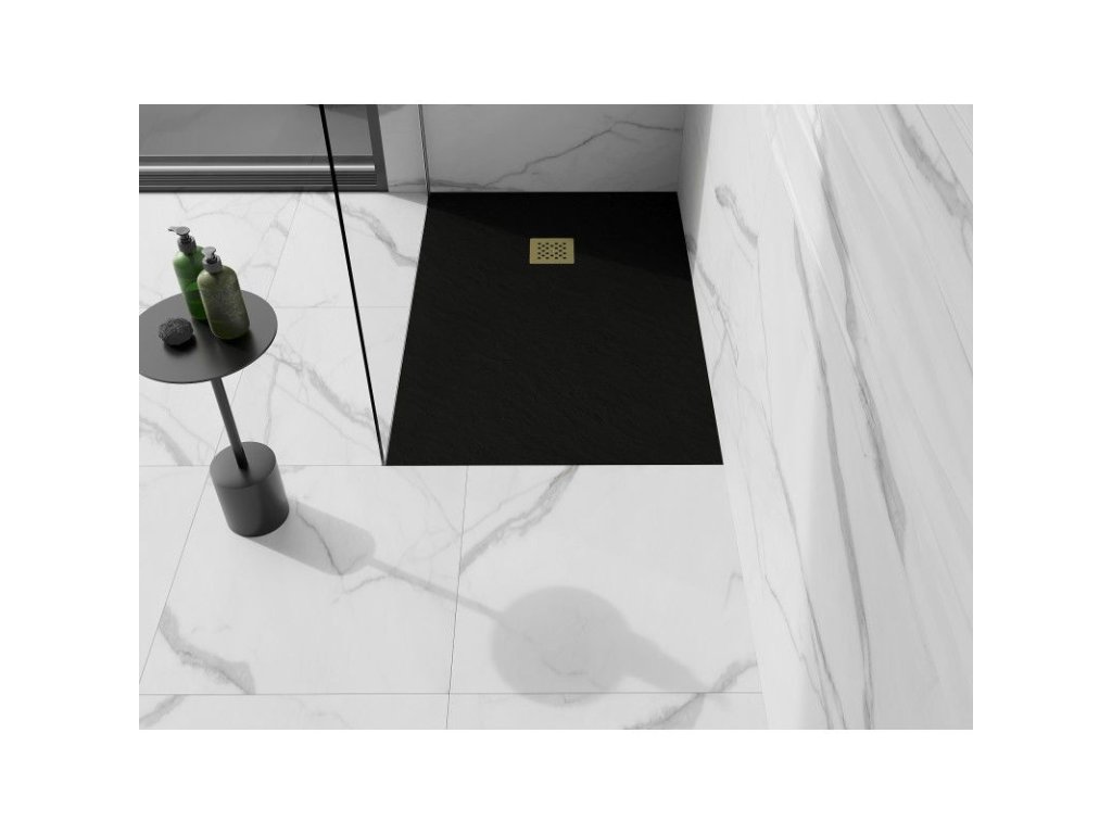 Kompozitná obdĺžniková sprchová vanička Mexen Stone+ 140 x 70 cm, čierna, zlatá mriežka - 44707014-G