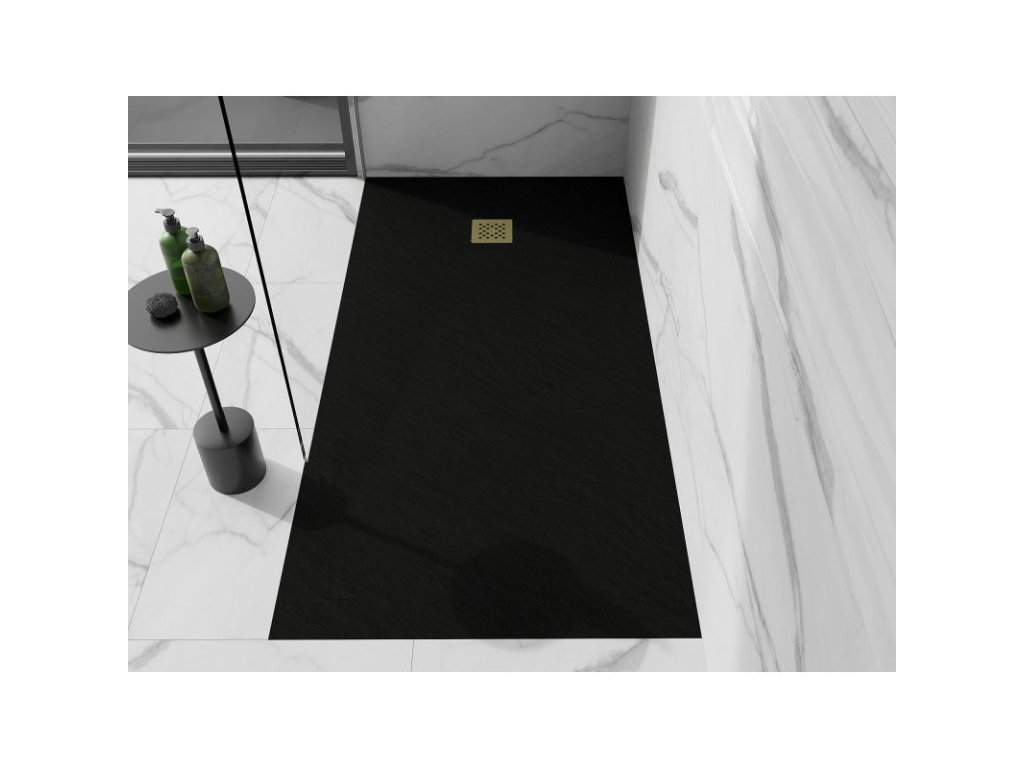 Kompozitná obdĺžniková sprchová vanička Mexen Stone+ 160 x 70 cm, čierna, zlatá mriežka - 44707016-G