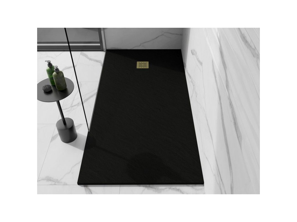 Kompozitná obdĺžniková sprchová vanička Mexen Stone+ 160 x 80 cm, čierna, zlatá mriežka - 44708016-G