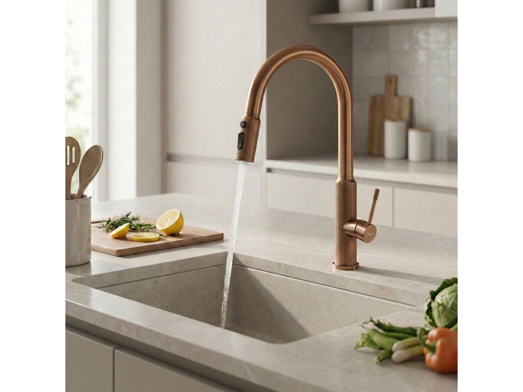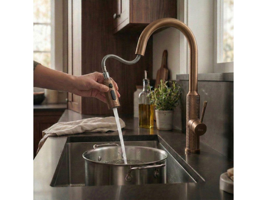 Kuchynská batéria Rea Master vo farbe brúsená meď spája industriálny dizajn s pokročilou technológiou a dodá Vašej kuchyni jedinečný charakter. Je vyrobená z masívnej mosadze a povrchovo upravená v teplom, matnom medenom odtieni, takže predstavuje odolné a mimoriadne estetické riešenie pre tých, ktorí hľadajú neštandardné prvky vybavenia.Povrch Brushed Copper – batéria je pokrytá úpravou v odtieni brúsená meď. Táto technológia zaisťuje vysokú odolnosť proti poškriabaniu a zmatneniu, pričom saténový, matný povrch účinne maskuje odtlačky prstov a uľahčuje údržbu.Výsuvná výpusť – pohyblivá výpusť na flexibilnej hadici je kľúčom k pohodliu pri kuchynských prácach. Umožňuje voľné umývanie veľkého riadu, oplachovanie komôr drezu aj presné napĺňanie vysokých nádob stojacich priamo na pracovnej doske.Zmena prúdu vody – ergonomický prepínač na výpusti umožňuje okamžitú zmenu režimu: z koncentrovaného súvislého prúdu na rozptýlený sprchový prúd, ideálny na šetrné oplachovanie zeleniny, ovocia alebo byliniek.Mosadzný korpus – konštrukcia z vysokokvalitnej mosadze zaručuje stabilitu, úplnú tesnosť a dlhú životnosť celej armatúry.Dekoratívne vrúbkovanie – charakteristickým detailom modelu Master je diamantová štruktúra na páke a na koncovke výpuste. Protišmyková úprava dodáva batérii surový, technický šmrnc a uľahčuje presnú reguláciu vody aj mokrou rukou.Batéria Rea Master Meď je ideálna do kuchýň v loftovom, industriálnom a modernom štýle. Jej teplá medená farebnosť a vysoká funkčnosť zjednodušujú každodenné povinnosti a zóne umývania dodávajú výrazný, profesionálny vzhľad.Dodatočné parametre