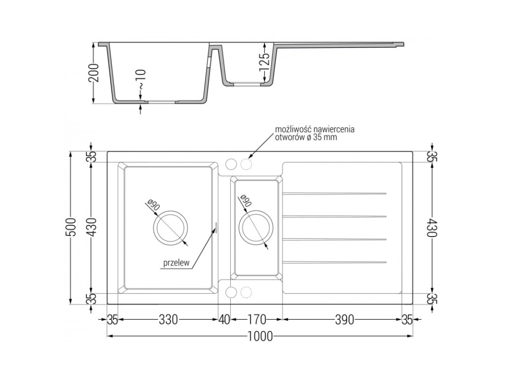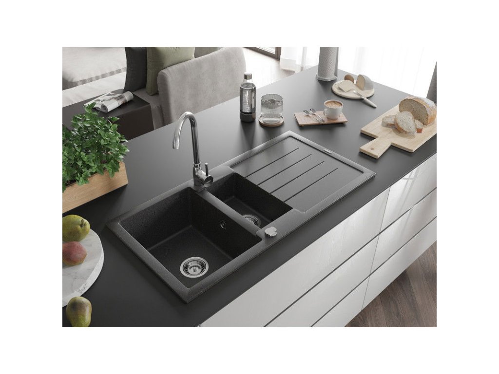 Technické údaje: rozmery: 1000x500x200 mm hĺbka komory: 190 mm (väčšia), 115 mm (menšia) rozmery komory: 430x330 mm (väčšia), 340x170 mm (menšia) priemer odtoku: ø90 mm model: 1,5-komorový s odkvapkávačom typ: zapustené do pracovnej dosky farba: čierny škvrnitý materiál: žula prepadový otvor: áno otvor pre batériu: áno automatický sifón v sade vysoká odolnosť proti poškriabaniu a zafarbeniu odolnosť proti tepelným šokom povrch pre ľahké čistenieDodatočné parametre