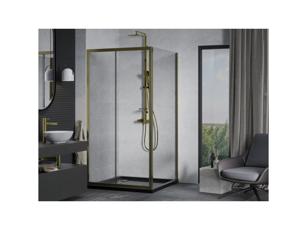 Mexen Apia posuvný sprchový kút 100 x 100 cm, transparentný, zlatý + Plochá sprchová vanička, čierna - 840-100-100-50-00-4070G