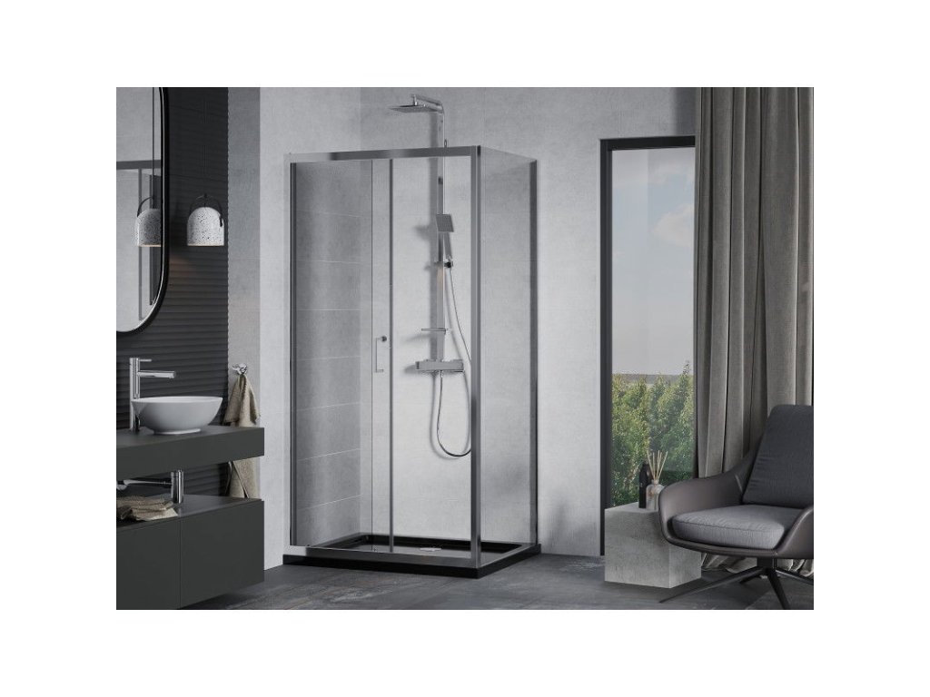 Mexen Apia sprchový kút posuvné dvere 110 x 90 cm, priehľadné sklo, profil chróm + sprchová vanička Flat, čierna - 840-110-090-01-00-4070