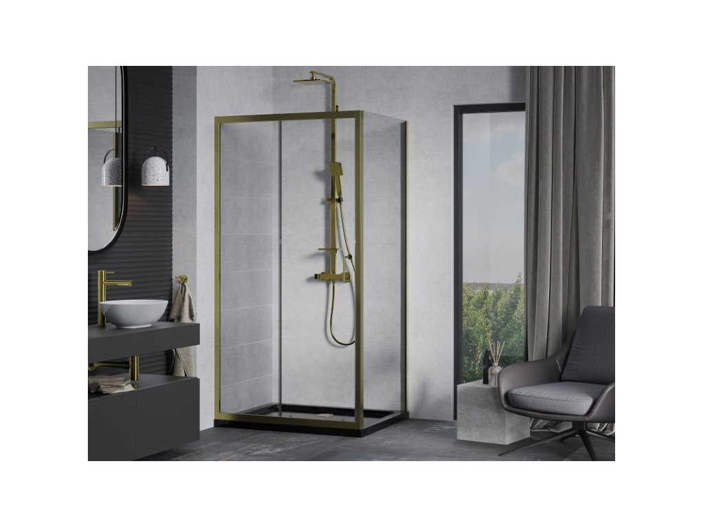 Mexen Apia sprchový kút posuvné dvere 140 x 100 cm, priehľadné sklo, profil zlatý + sprchová vanička Flat, čierna - 840-140-100-50-00-4070G