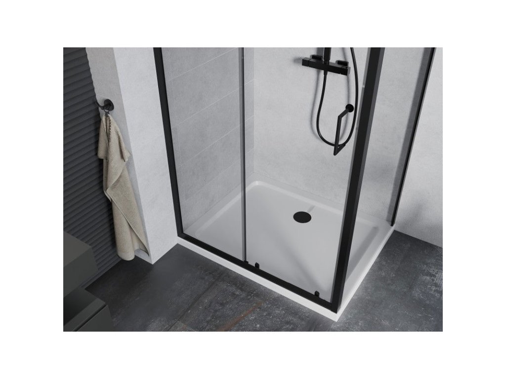 Mexen Apia sprchový kút posuvné dvere 140 x 90 cm, priehľadné sklo, profil čierny + sprchová vanička Flat, biela- 840-140-090-70-00-4010B